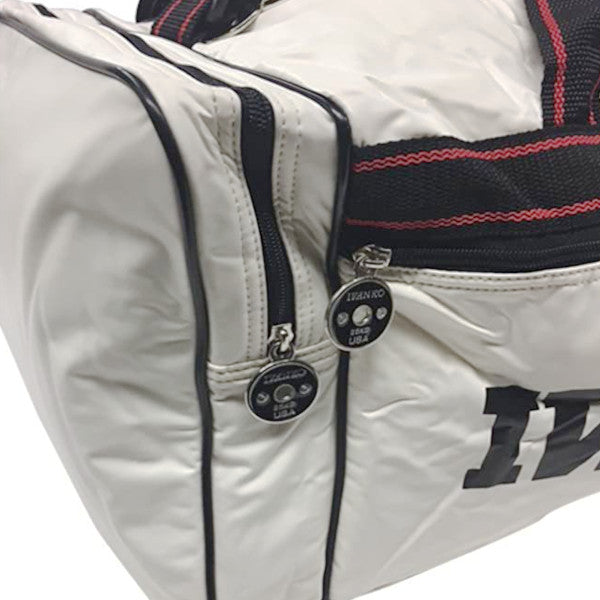 A very happy IVANKO customer called this "the world's best gym bag". Unlike canvas, which attracts all the nasty stuff on the men's locker room floor (and then it gets thrown on the passenger seat in your car, yuk) the IVANKO Gym Bag PVC material is very easy to wipe down and maintain cleanliness. It's rigid yet flexible construction enable it to stay open when you place it on the floor without flopping all over the place and drooping like a canvas bag. The end zipper pockets are designed to zip down to a level that keeps the compartments from collapsing - preventing the contents from spilling all over the ground when you're walking with it - unlike other bags that have the zippers that go all the way to the bottom of the bag.