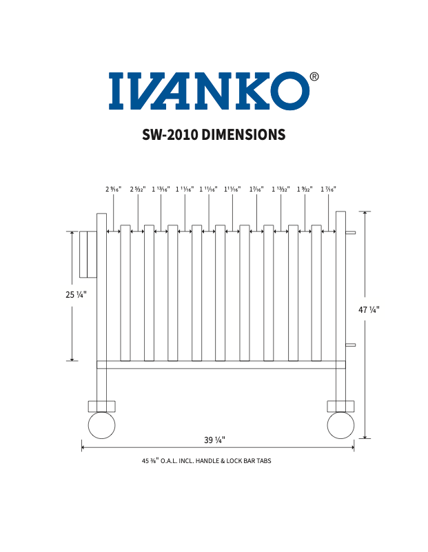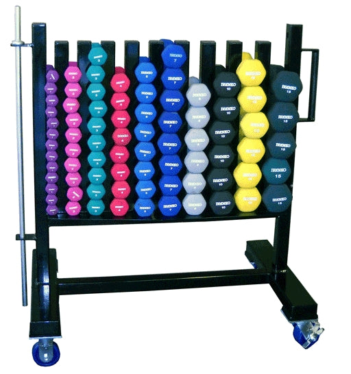 Our IVANKO Aerobic Rubber Hex Dumbbells (IRD) fit perfectly in our heavy-duty rolling dumbbell racks. In addition, we make a front-facing rack (separate page coming soon) for one pair of each of the 10 available sizes of IVANKO Rubber Hex Dumbbells (1-5, 7, 8, 10, 12 & 15 lb pairs). Rack with IRD Dumbbells (Part No. SW-2010-IRD/PK takes (16) IRD-1, (10) ea IRD-2 & 3, (8) ea IRD-4 & 5, & (6) ea IRD-7, 8, 10, 12 & 15. 41 pairs total.